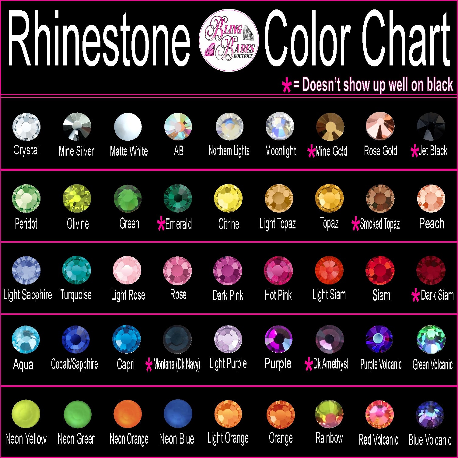 Desplácese hacia abajo para ver la diferencia entre lentejuelas holográficas y diamantes de imitación y las tablas de colores.